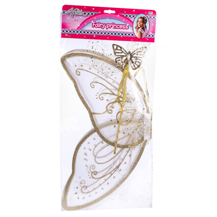 La fantasien fly med disse vakre, gullfargede sommerfuglvingene og matchende sommerfuglstav! Vingene måler 58x59 cm og gir et majestetisk utseende, mens staven på 35 cm er perfekt for små hender. Perfekt for lek, kostymefester og magiske eventyr!