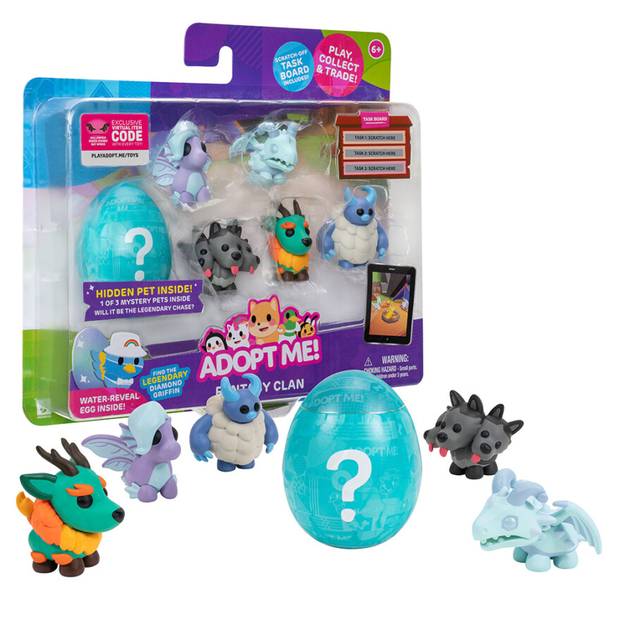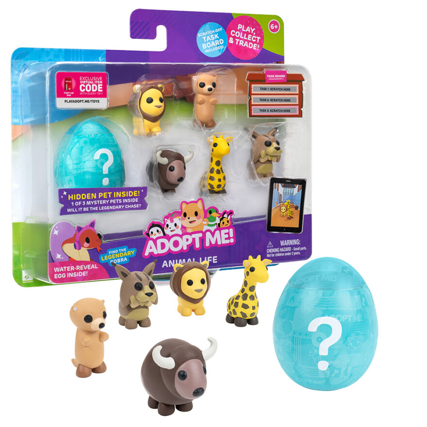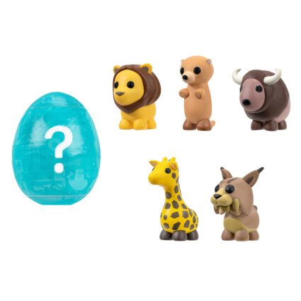 Opplev gleden ved å eie svært ettertraktede kjæledyr fra onlinespillet Adopt Me! For å oppdage det mystiske kjæledyret, pakk ut egget og senk det i vann for å avsløre en av tre forskjellige eggstiler fra spillet. Inne i egget finner du ett av tre 5 cm mystiske kjæledyr i plast av ulik sjeldenhet, alle med tema. Som en bonus har Animal Pet Multipack én eksklusiv virtuell gjenstandskode.