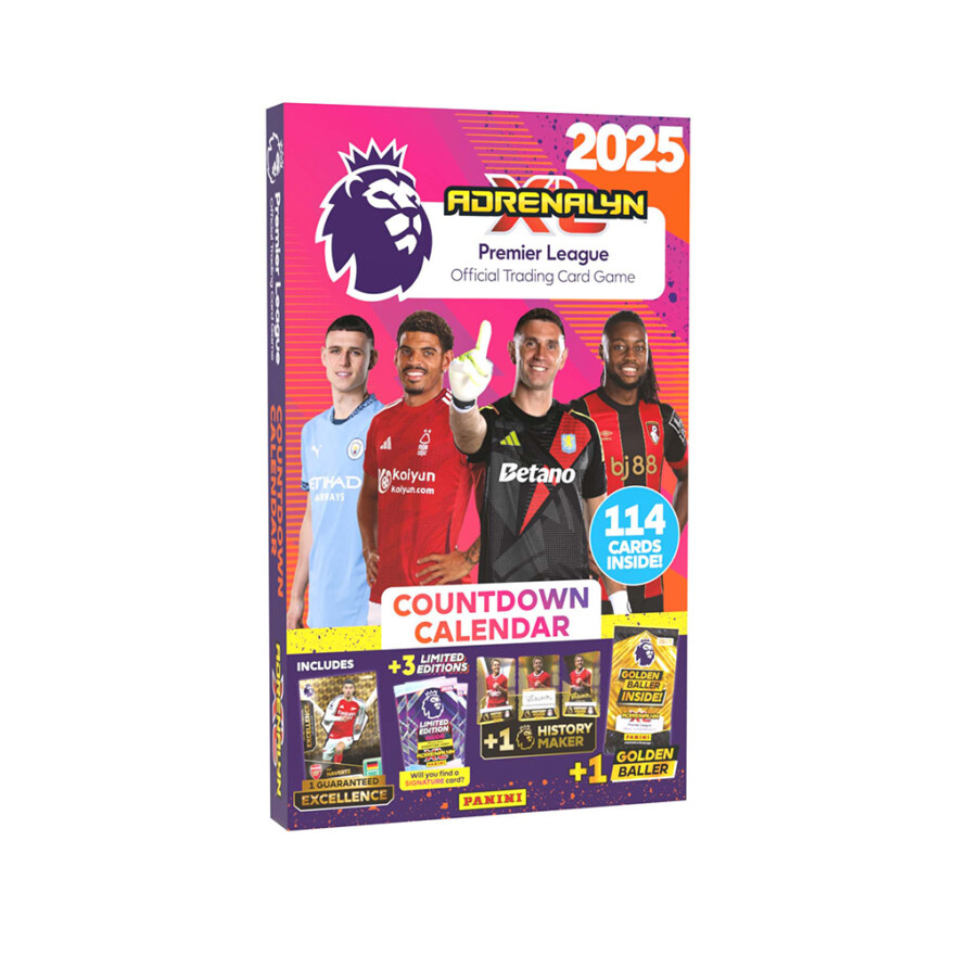 AdrenalynXL Premier League 2025 Adventskalender: En julekalender med 24 luker, hver fylt med spennende fotballkort fra årets Premier League-sesong. Totalt inneholder kalenderen 114 fotballkort, inkludert flere eksklusive kort!