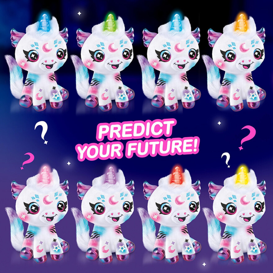 Oppdag fremtiden din! Still enhjørningen et Ja eller Nei-spørsmål og trykk på hornet. Utrolig, den lyser opp! Se på spådomsguiden for å tyde svaret.For å designe og tilpasse plysj, bruk sjablonger til å fargelegge trendy ikoner eller bli kreativ og fristil. Bare klistre sjablonger på plysj, velg en farge og spray med airbrush - og når du er klar for et nytt design er det bare å vaske plysjen og begynne å dekorere igjen.