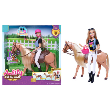 Anlily Hesteklubb inkluderer dukke, solbriller, hestepisk, ridehjelm, ridehansker og hest med bevegelige deler.