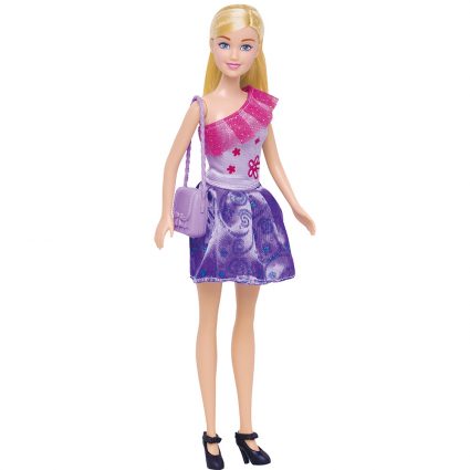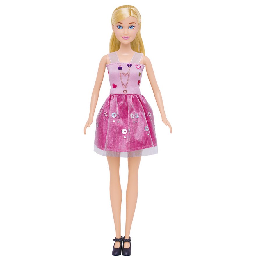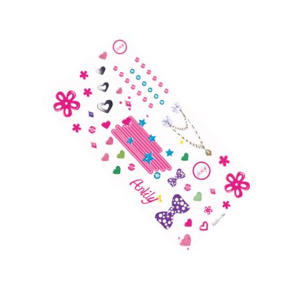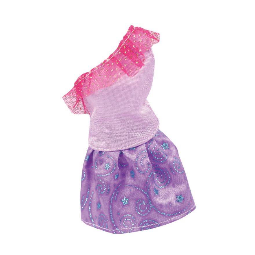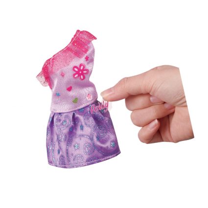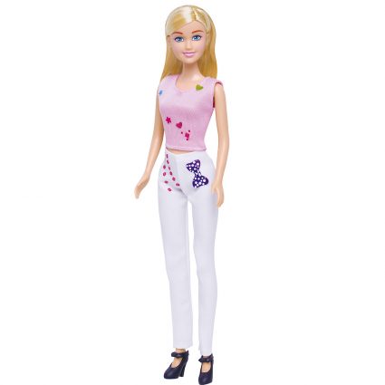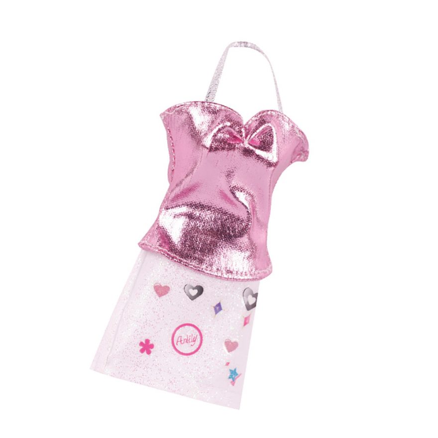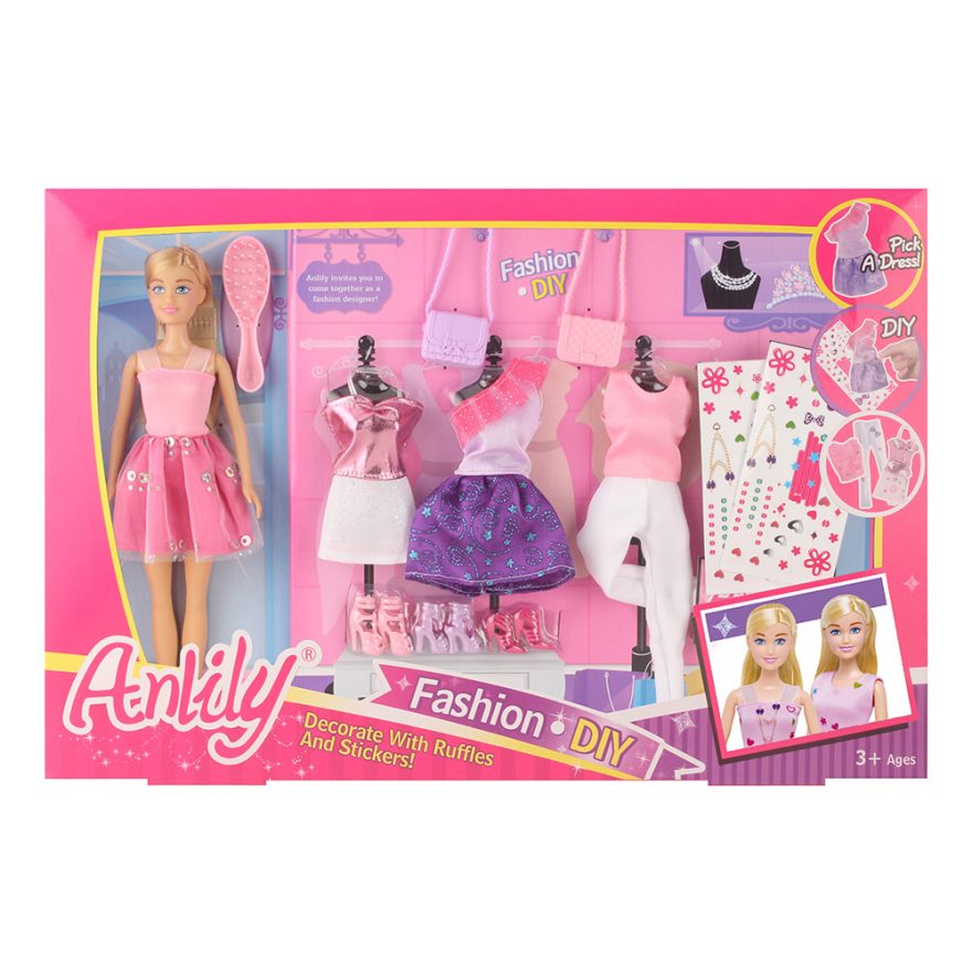 Sett med dukke, klær, tilbehør og klistremerker som du kan dekorere klærne med.