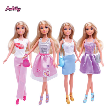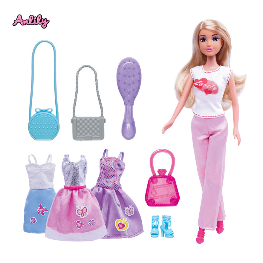 Oppdag Anlily-settet med dukke og alt du trenger for kreativ lek og moro! Dette settet inneholder en Anlily-dukke, tre ekstra kjoler i ulike farger og design, tre par sko, to vesker og et ark med klistremerker. Klistremerkene gir barna muligheten til å dekorere klærne og skape unike antrekk, slik at de kan slippe kreativiteten løs.