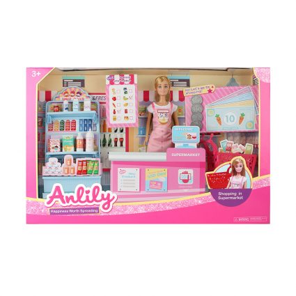 Dette settet inkluderer alt du trenger for en handletur med Anlily, som matvarer, penger, shoppingvogn og kasse.