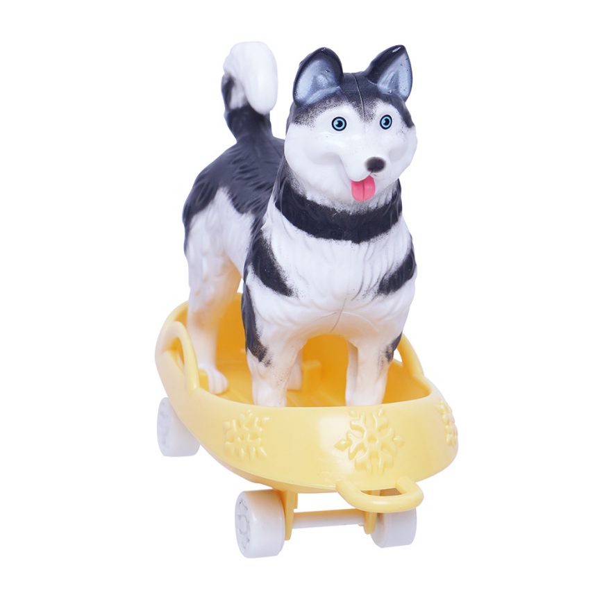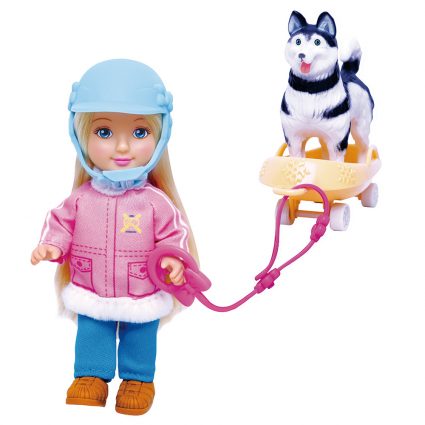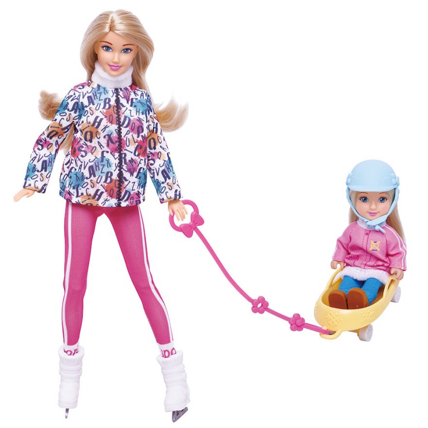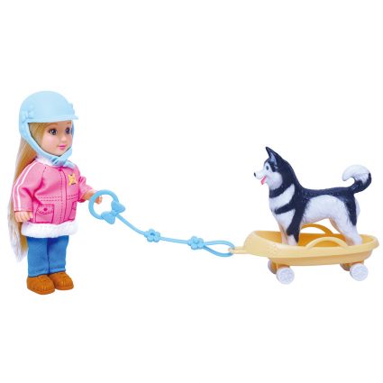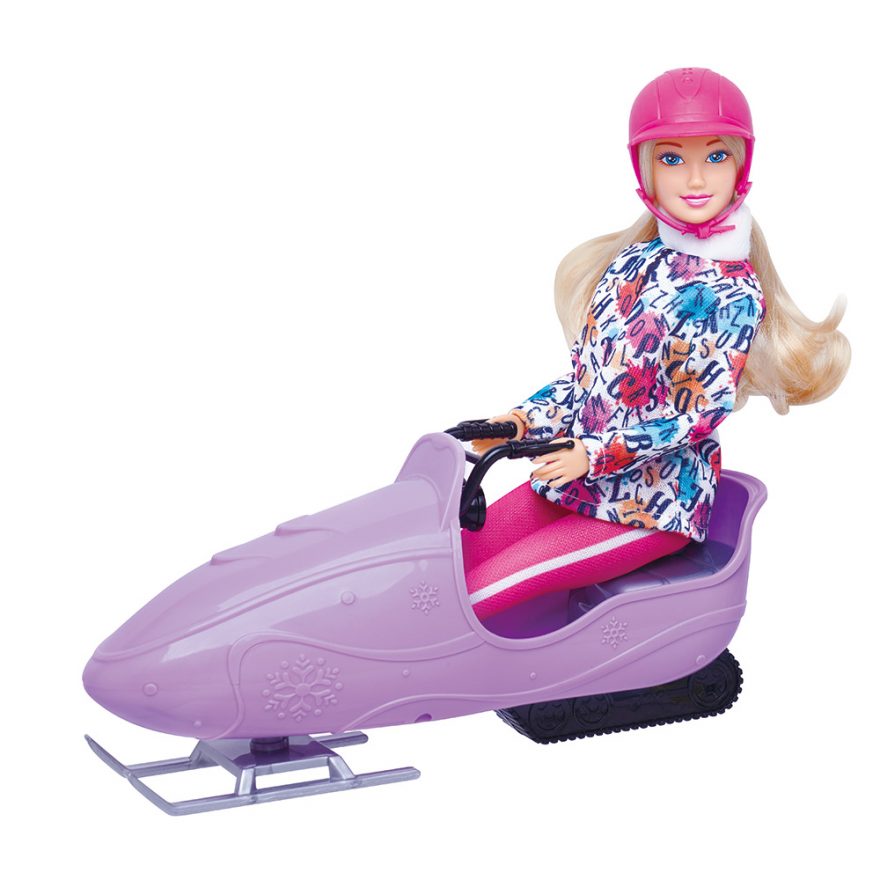 Vintersett med 2 dukker, hund, snøscooter, snømann og slede.