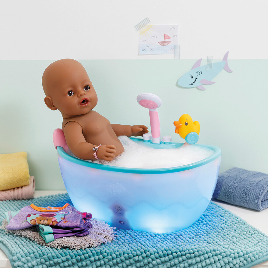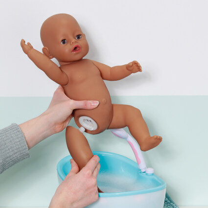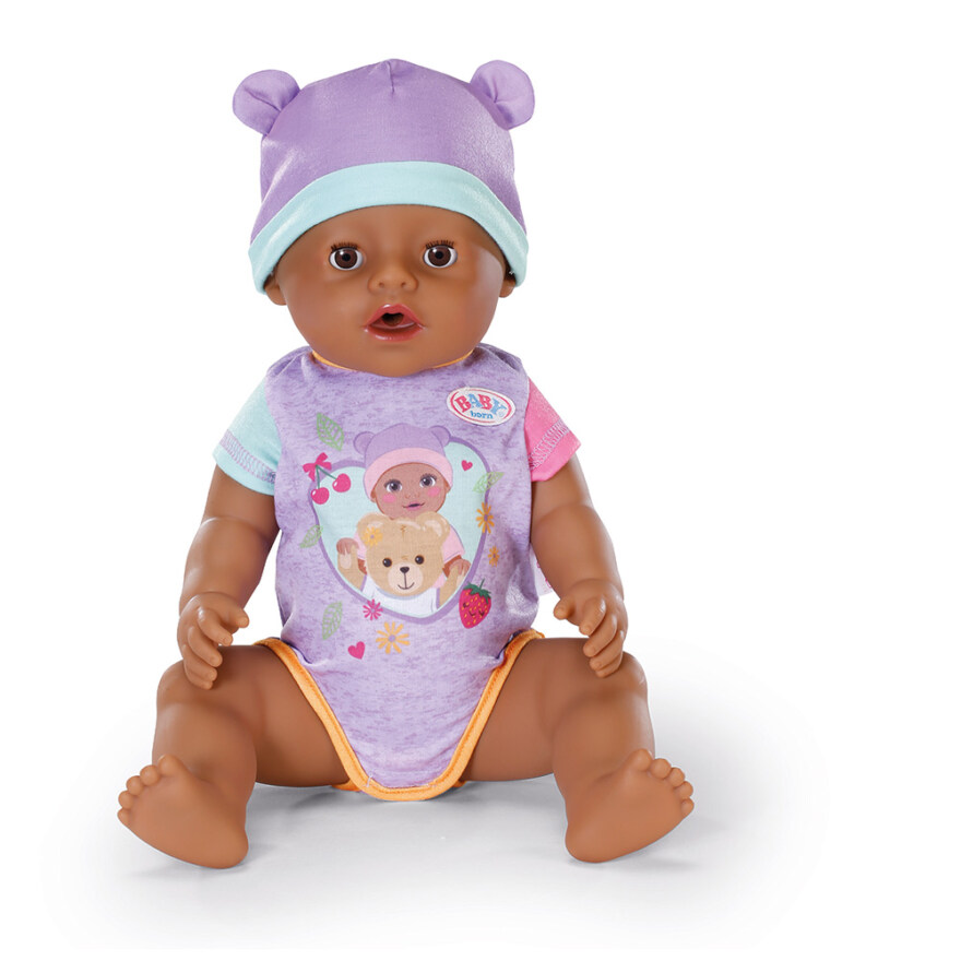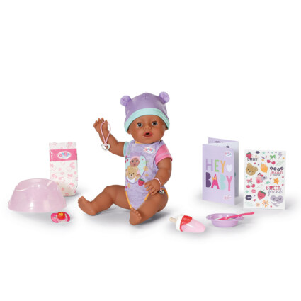 BABY born Eva bringer mye moro inn i barnehagen med sine 10 naturtro funksjoner: drikke, bading, kontrollert pottetrening, lukke øynene ved å snu dukken og mye mer. Hun spiser fra den lille tallerkenen sin, og matmagien gjør maten hennes synlig. Jeg lurer på hva som skal til i dag?