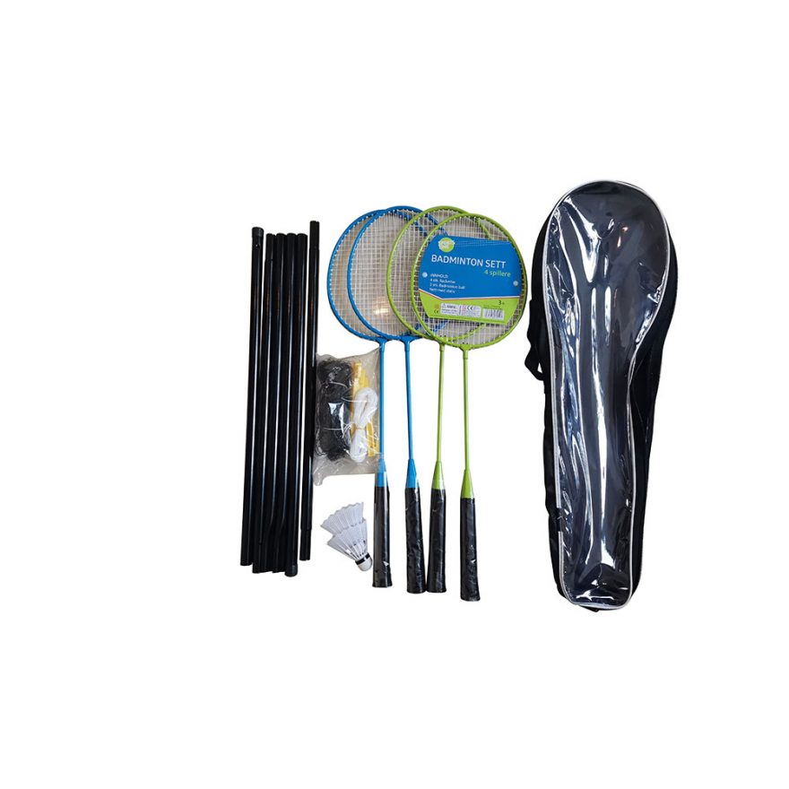 Badminton sett for 4 personer. Inkluderer nett, 4 racketer og 2 badmintonhøner.