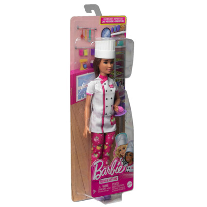 Barbie-dukken elsker å lage deilige kaker som en profesjonell konditor! Hun er alltid klar til å prøve ut nye oppskrifter, iført uniformen med konditorjakke og hatt. En deilig cupcake på tallerken følger også med, som hun kan servere til kundene sine. Barn kan drømme stort om sine mange fremtidige muligheter med Barbie-karrieredukkene!