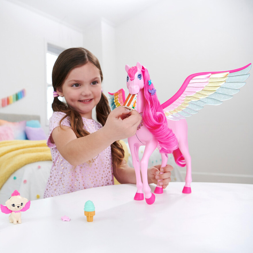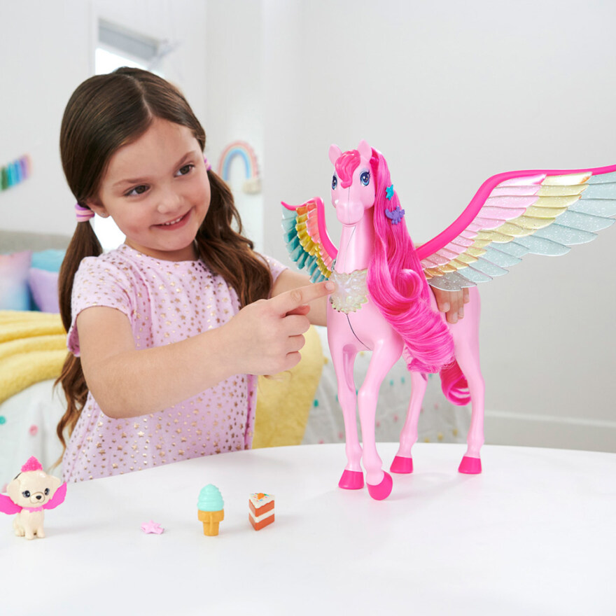 La fantasien fly på vingene til denne rosa Barbie® pegasus! Barn kan spille ut sine favorittscener fra Barbie® A Touch of Magic™, eller finne på fantastiske eventyr selv. Pegasusen har regnbuelys og lyder som aktiveres på flere måter. Hun kommer også med en magisk valp og søte tilbehør!