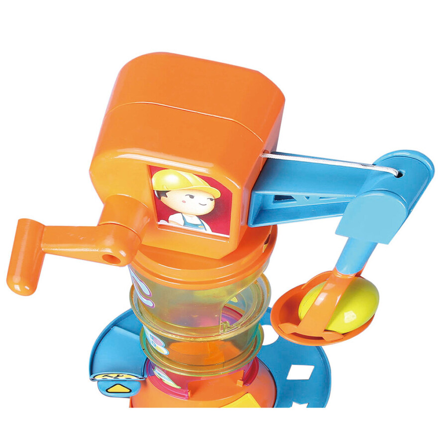 Lekesett med Volvo-tema med stabledeler og kran. Stablekoppene stables for å danne et tårn, som deretter har kranen lagt til seg, komplett med løftearmen og sveivespaken. Bruk kranen til å løfte baller til toppen, slipp dem deretter ned i koppen og se på hvordan de faller nedover tårnet. Flytt dumperen på plass, og den kan fange ballene, klar til å frakte dem dit de skal. Settet inkluderer en dumper basert på Volvo-design som nesten ser ut som en tegneseriefigur, komplett med store øyne på frontruten. En del av BB Junior-serien av lekebiler, kjøretøy og lekesett.