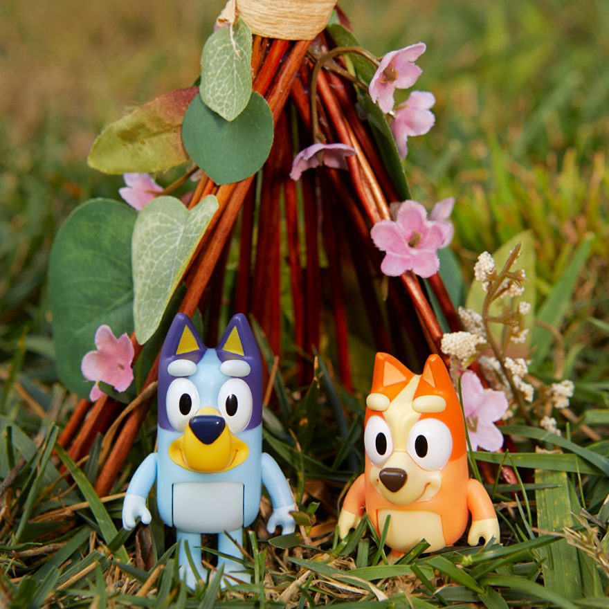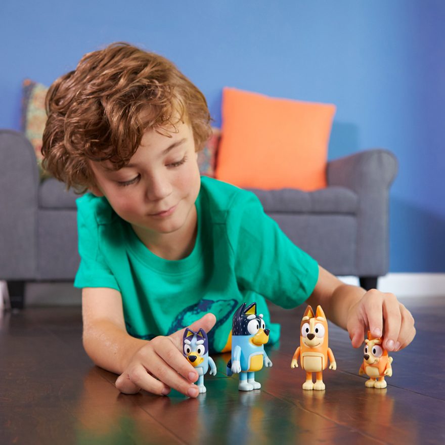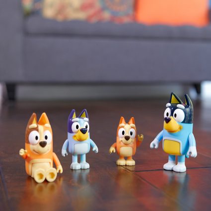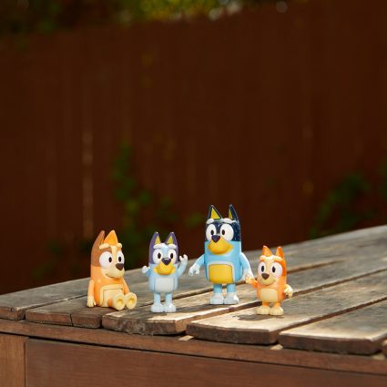 Fire karakterer med Bluey-familien eller Bluey og venner. Du kan nå få noen av de elskelige karakterene fra Bluey og gjenskape flere av de kjente TV-episodene!