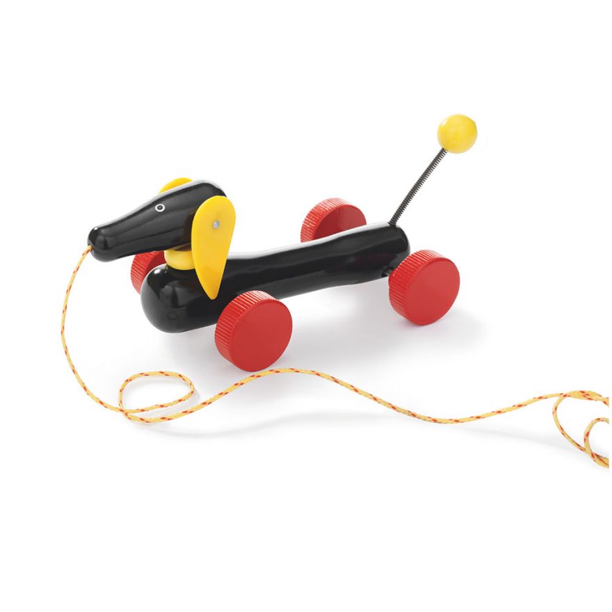 Klassisk trekkeleke fra BRIO i tre med usymmetriske hjul for morsomme bevegelser. Dachsens hale, hode og ører har en gyngende bevegelse når barnet drar den med seg. En flott leke som oppfordrer barnet til å krabbe og gå.