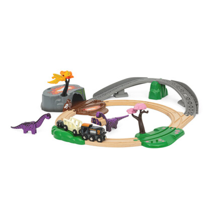 Utforsk dinosaurenes fantastiske forhistoriske verden med Opplevelsessett med dinosaurer. Togsettet inneholder 21 deler og innbyr til mangfold lek med dinosaur-tema. Settet inkluderer et tog med to vogner, flere kulisser – som den farlige lavahulen og gressbevokste spor – samt at toget kjører på ulike nivåer.