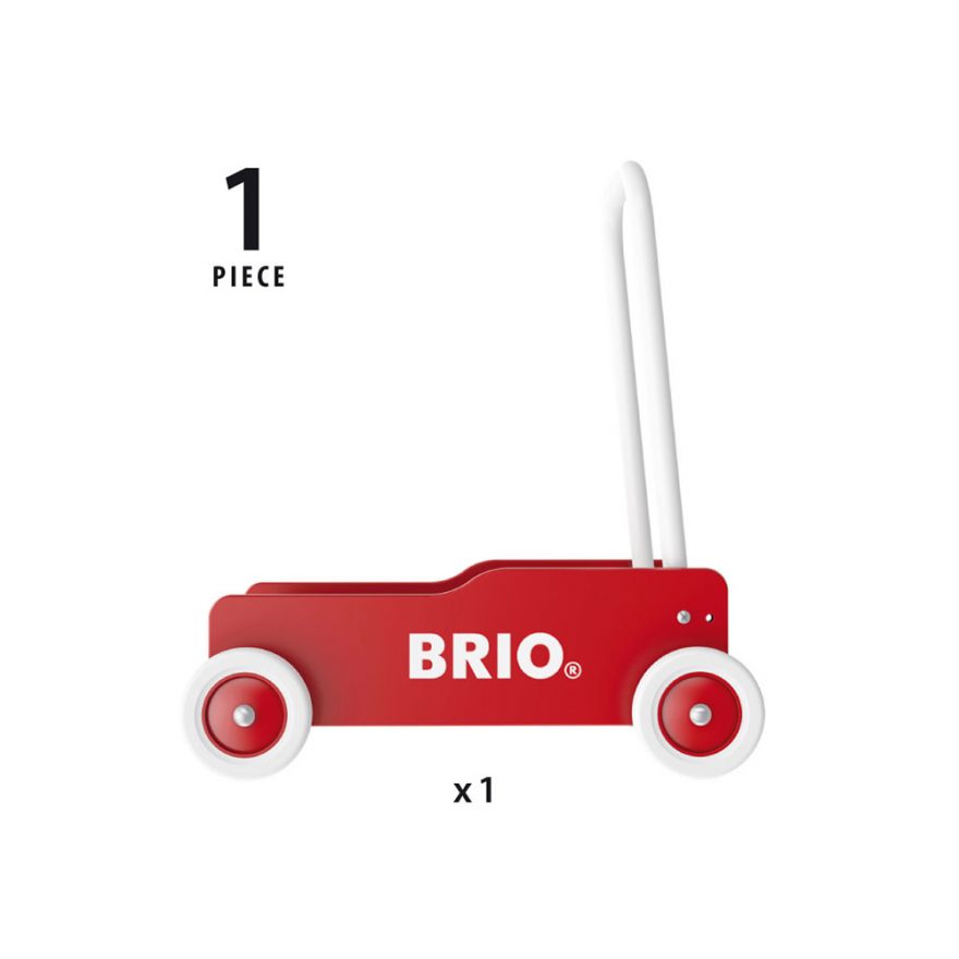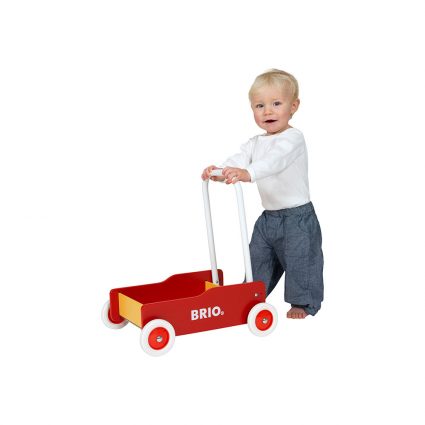 Den klassiske BRIO lær og gå vognen i tre. Med justerbart håndtak og brems. Veldig praktisk til å frakte leker med for de små.