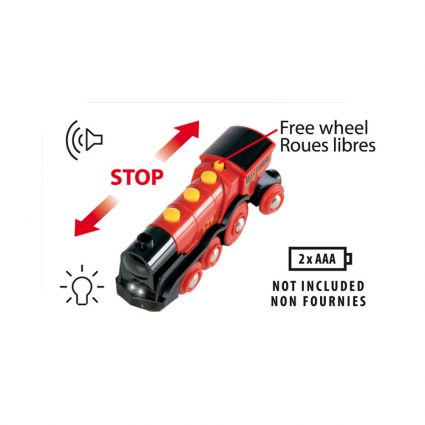 Hold kommende togførere sysselsatt! Det store batteridrevne lokomotivet har to frontlykter og manuelle knapper for "full fart forover", revers og den karakteristiske "tøff-tøff"-lyden. En bryter på toppen gir mulighet til frihjulsbevegelse uten batteri-funksjon.
