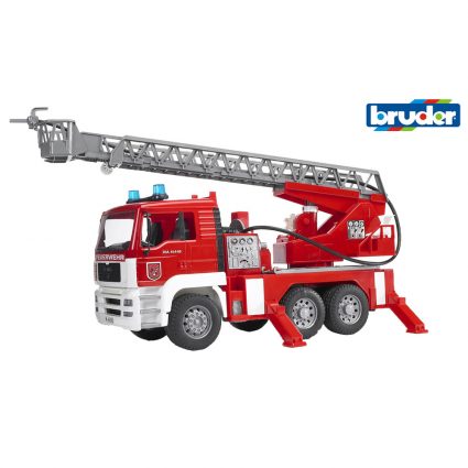 Brannbil med justerbar stige, lyd og lys, vanntank og slange.