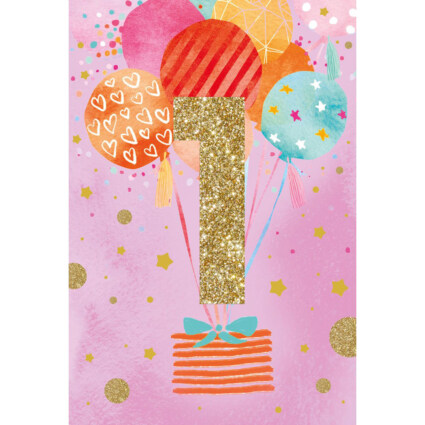 Feir den aller første bursdagen med et håndlaget kort som stråler av glede og gullglitter. Dette rosa kortet er fylt med festlige detaljer som ballonger og konfetti, og passer perfekt til små bursdagsbarn som skal feires med stil.