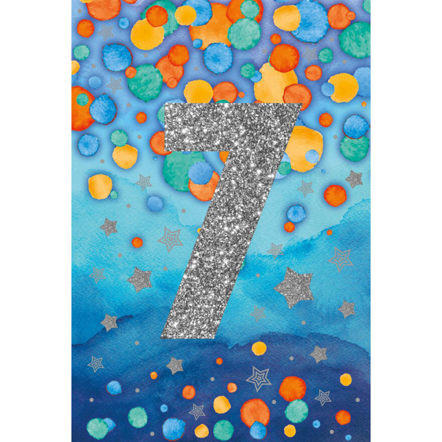 Et glitrende bursdagskort som markerer 7-årsdagen med stil. Håndlaget og fylt med festlige detaljer som gjør dagen ekstra spesiell.