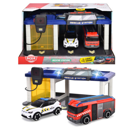 Redningsstasjon fra Dickie Toys med lys, lyd, åpne dører og com-radio. Inkludert norsk politibil og brannbil med frie hjul.