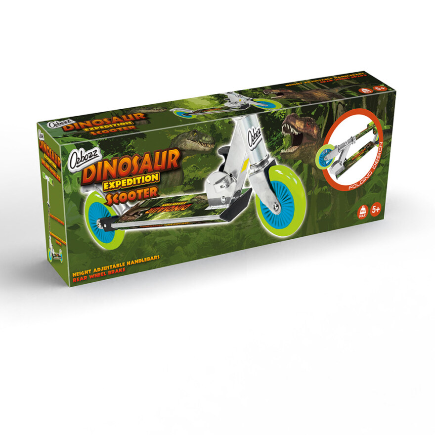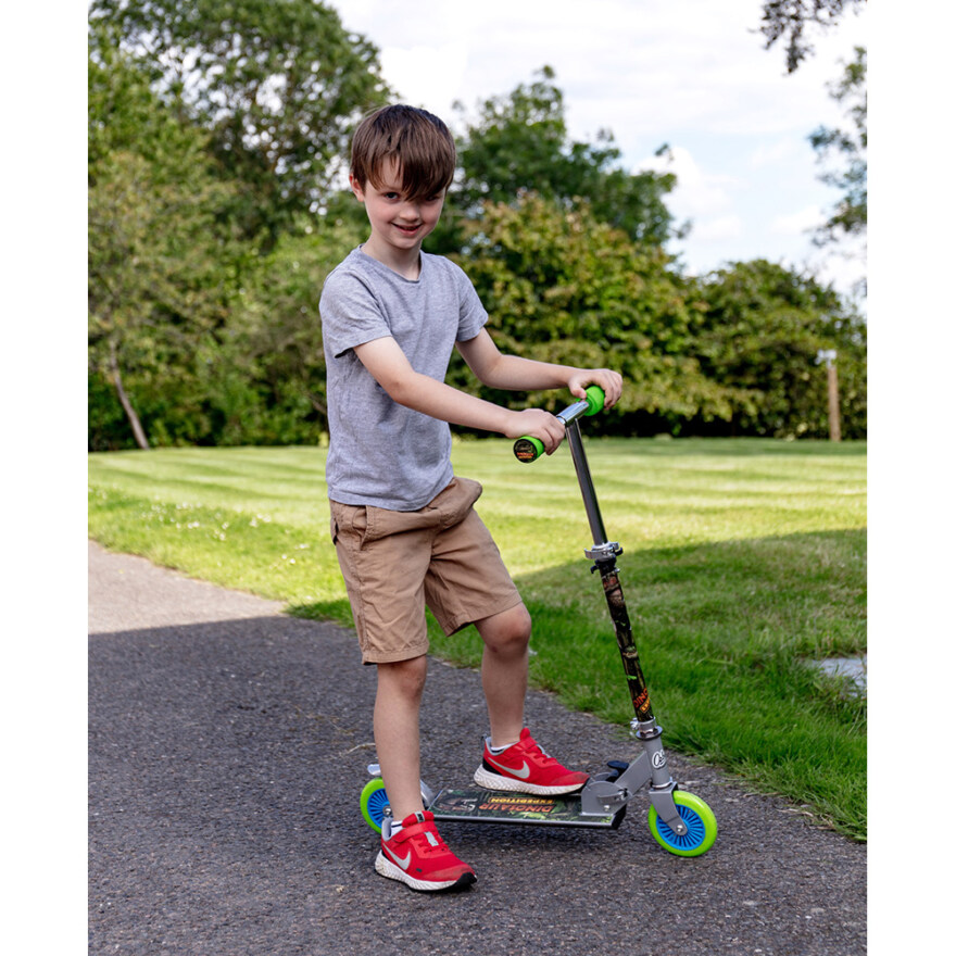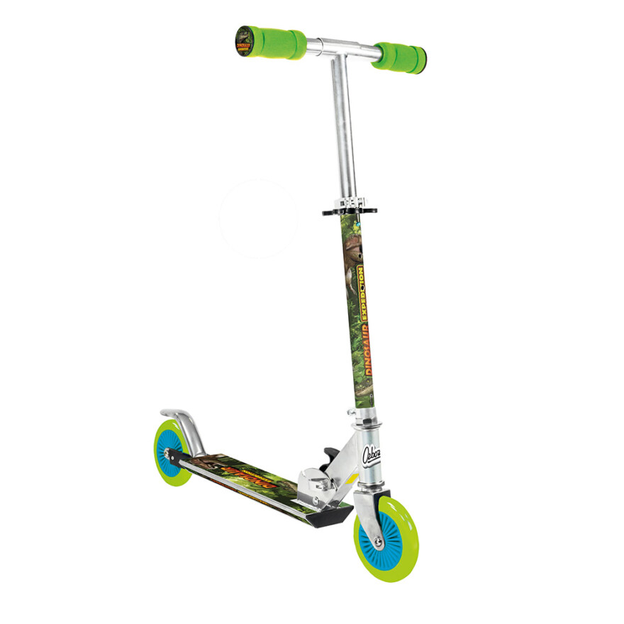 Tohjuls dinosaurscooter som kan foldes ned til et kompakt design for enkel oppbevaring og praktisk transport. Scooteren har et grønt og krom fargetema, med dinosaurdesign. Forhjulet spinner 360 grader og bakhjulet har en brems for maksimal kontroll. Den er ideell for scooting, i tillegg til å utføre triks og stunts.