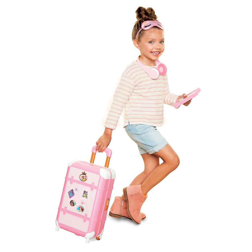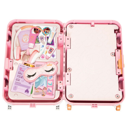 Disney Princess Style Collection World Traveler har alt en prinsesse trenger for å reise med stil! Den har alt du trenger for å reise, og oppbevares perfekt i den stilige og oppdaterte lekekofferten. Lat som om du sikrer eiendelene dine med den falske kombinasjonslåsen. Hold kontakten på flyplassen ved å koble til nettbrettet ditt, eller frisk deg opp før avgang med lekeleppepomaden og hånddesinfeksjon.