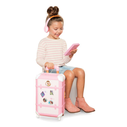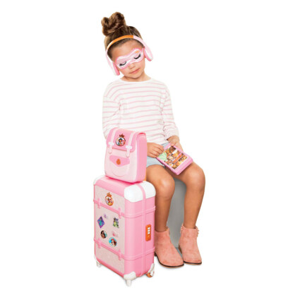 De ekte fungerende hjulene og det uttrekkbare håndtaket sørger for at du alltid rekker flyturen! Slapp av på flyet med lekehodetelefonene og sovemasken. Med pass og billett i folioen, er du klar til å dra på eventyr til fjerne steder!
