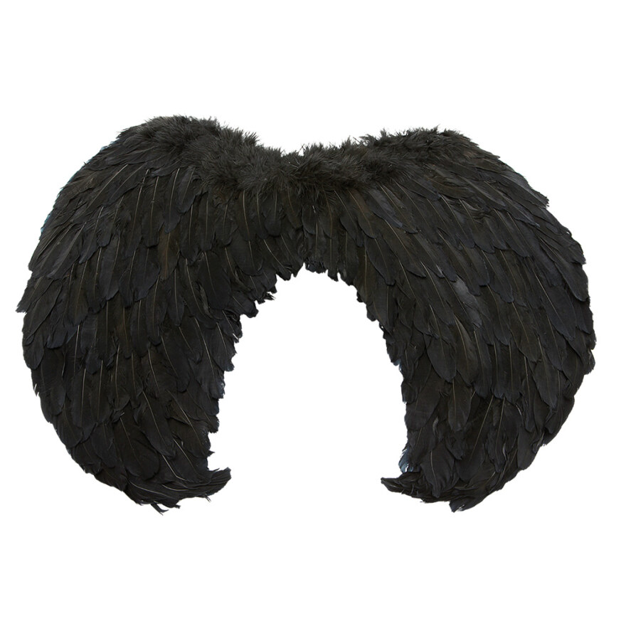 Stilig tilbehør til halloween eller karneval. Vingene er av bølgepapp og ekte fjær. Festes rundt armer/skuldre.