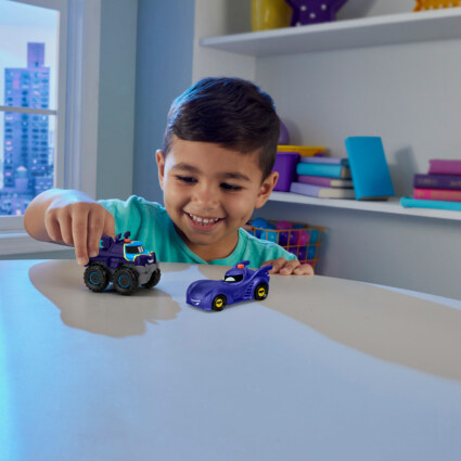 Kappløpet mot forbryterne kan starte med disse Batwheels™ Light-Up Racers-lekebilene fra Fisher-Price®. Barna kan trykke på knappen på toppen av hvert kjøretøy for å se favorittkarakterene sine bli levende med kule, lysende uttrykk! Hver kjøretøysett inkluderer 2 karakterer fra serien i målestokk 1:55 med Batwheels™-stil og rullende hjul. Se etter flere Batwheels™ Light-Up Racers-biler for å trappe opp jakten på forbryterne med lyseffekter!