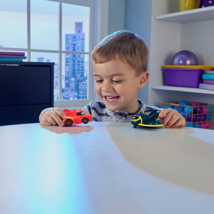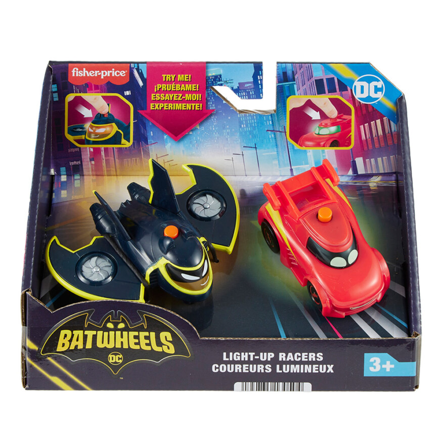 Kappløpet mot forbryterne kan starte med disse Batwheels™ Light-Up Racers-lekebilene fra Fisher-Price®. Barna kan trykke på knappen på toppen av hvert kjøretøy for å se favorittkarakterene sine bli levende med kule, lysende uttrykk! Hver kjøretøysett inkluderer 2 karakterer fra serien i målestokk 1 : 55 med Batwheels™-stil og rullende hjul. Se etter flere Batwheels™ Light-Up Racers-biler for å trappe opp jakten på forbryterne med lyseffekter!