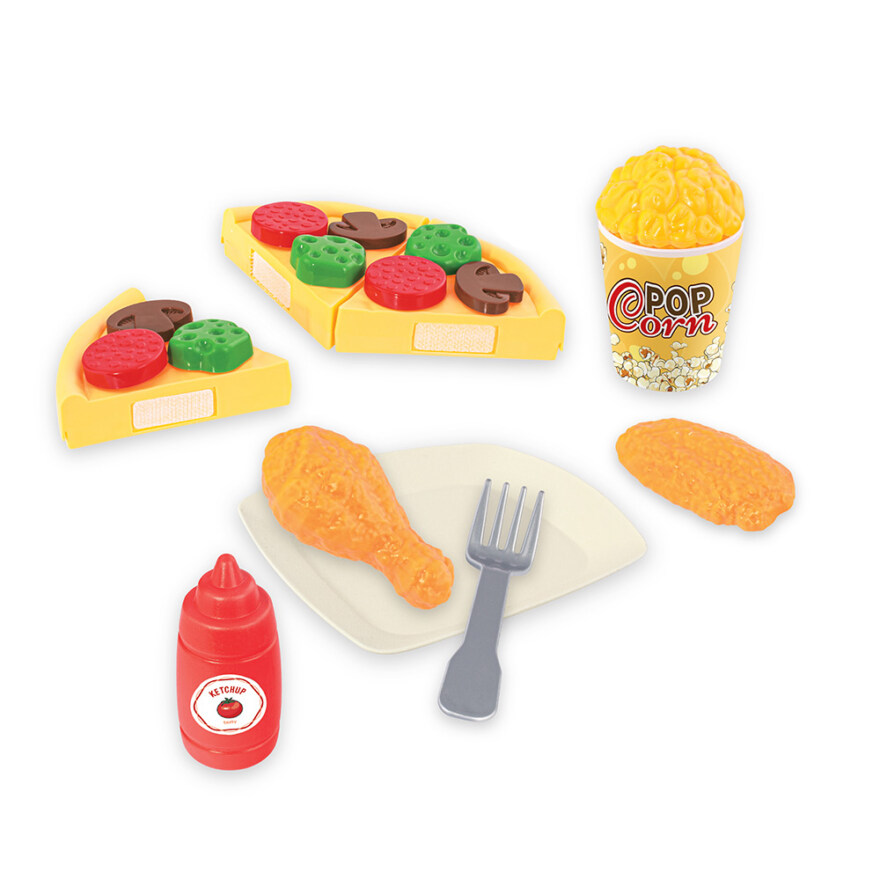 Dette matsettet oppmuntrer til rollelek og kreativitet, og passer perfekt til små kokker som elsker å lage og servere mat. Inneholder: tre pizzaskiver, nuggets, popcorn, honning, tallerken og bestikk.