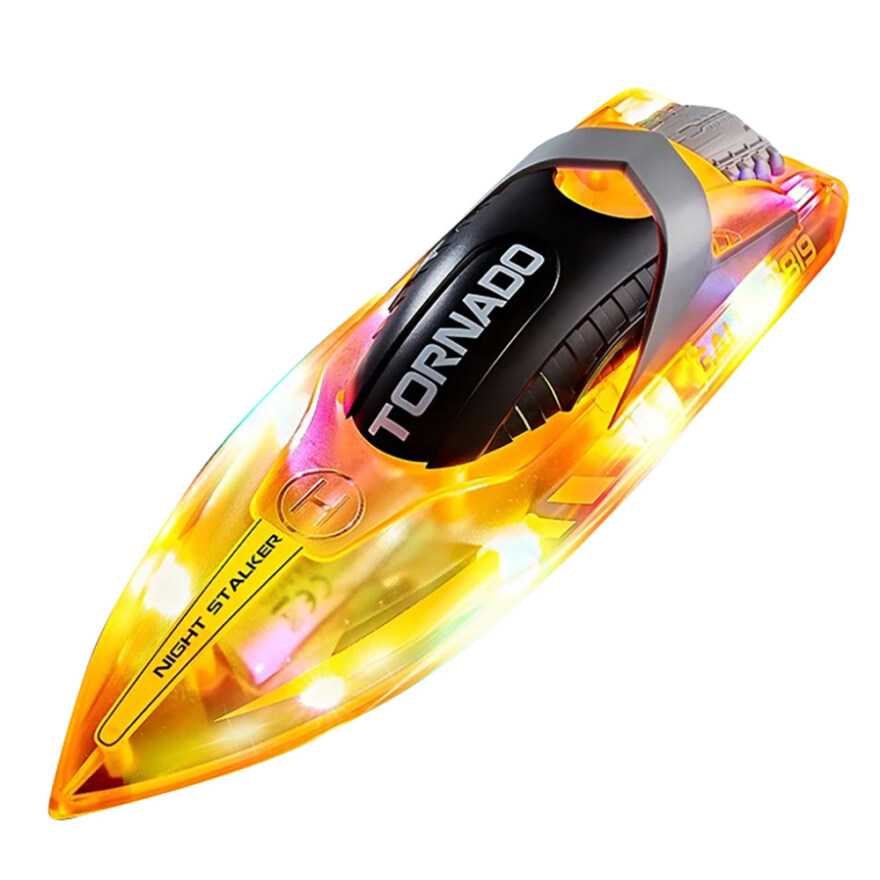 En rask båt med en lengde på 25 cm og en toppfart på 15 km/t, alt du trenger for en morsom dag på sjøen. Hvis båten havner opp ned i vannet, kan du snu båten på rett kjøl ved hjelp av fjernkontrollen. Det er LED-lys i hele båten, båten har trinnløs gass og sving. Gassen kan stilles inn i to hastighetsposisjoner - henholdsvis lav og høy.