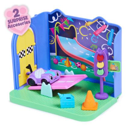 Gjør deg klar for noen kattastiske lekeeventyr i Carlita Lystrende Lekerom! Dette luksuriøse Gabby's Dollhouse-lekesettet er fylt med spennende detaljer. Pakk ut dukkehusleveringene dine, akkurat som Gabby gjør i showet, og oppdag to overraskelsesleker: en trafikkkjegle og en bensinboks. Bruk de når Carlita skal ut på eventyr!