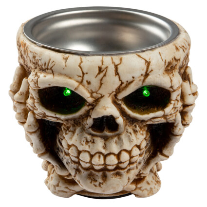 Godteriskål med lyd og lys i form av en hodeskalle. 90% vinyl, 10% rustfritt.