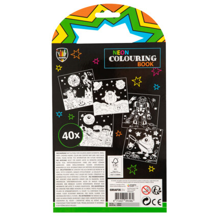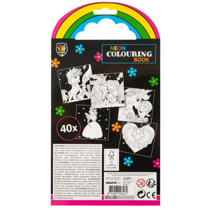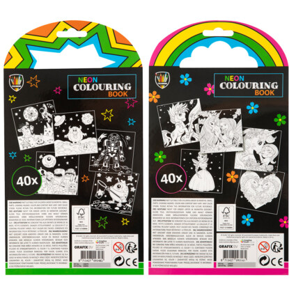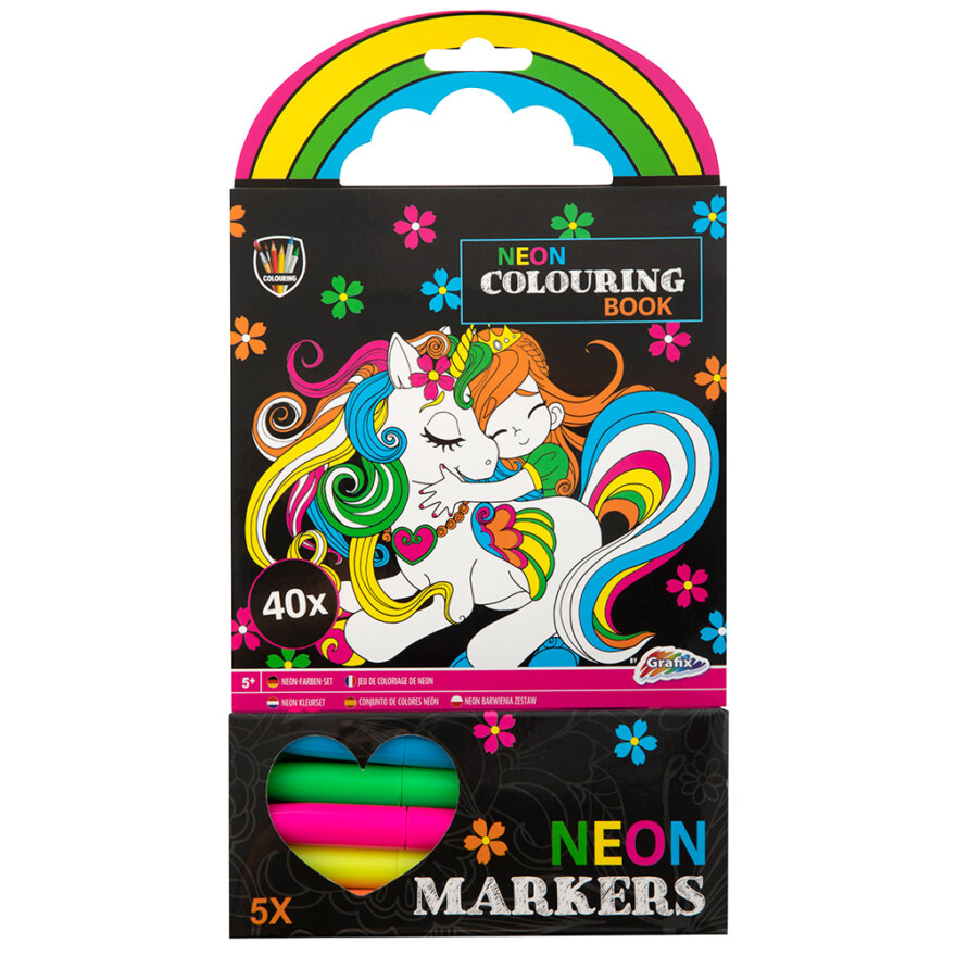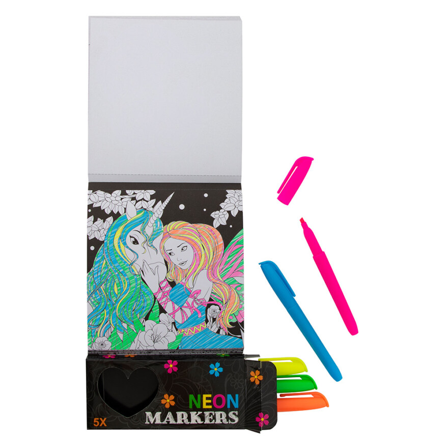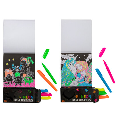 Neon fargeleggingsbok med 40 sider. Inkluderer 5 neonmarkører. Velg mellom rom- eller unicorn-tema.