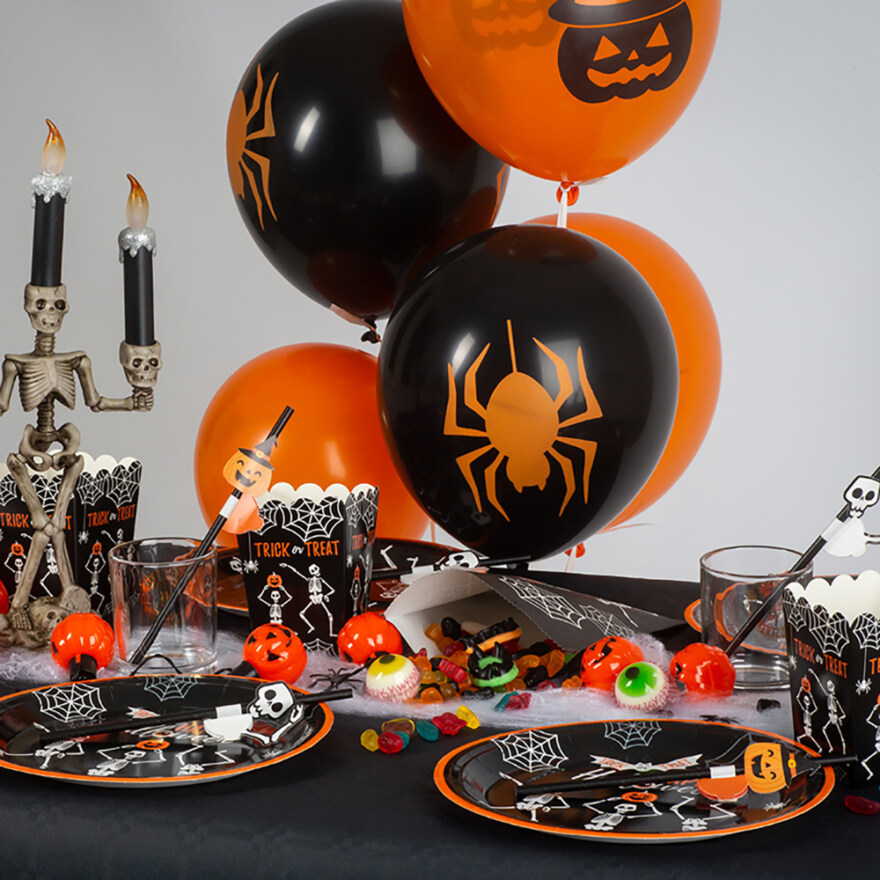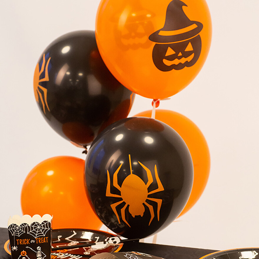 Ingen fest uten ballonger! Pakken inneholder 6 stk. ballonger i svart og oransje farge med motiv av heks, flaggermus, gresskar og edderkopp. Perfekt pynt til Halloween-festen!