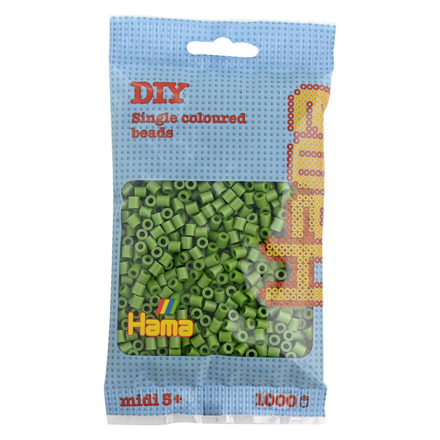 Hama Midi perler i pose med 1.000 stk. Farge: Olivengrønn. Med perler i mange farger kan du lage mange slags mønstre og figurer. Lek med perler øker kreativiteten og trener finmotorikk, mønstergjengivelse, fargelære, logikk og geometrisk sans. Kun fantasien setter grenser.