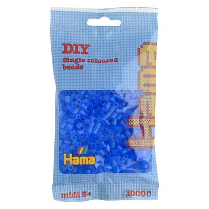 Hama Midi perler i pose med 1.000 stk. Farge: Transparent blå. Med perler i mange farger kan du lage mange slags mønstre og figurer. Lek med perler øker kreativiteten og trener finmotorikk, mønstergjengivelse, fargelære, logikk og geometrisk sans. Kun fantasien setter grenser.