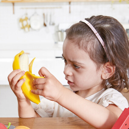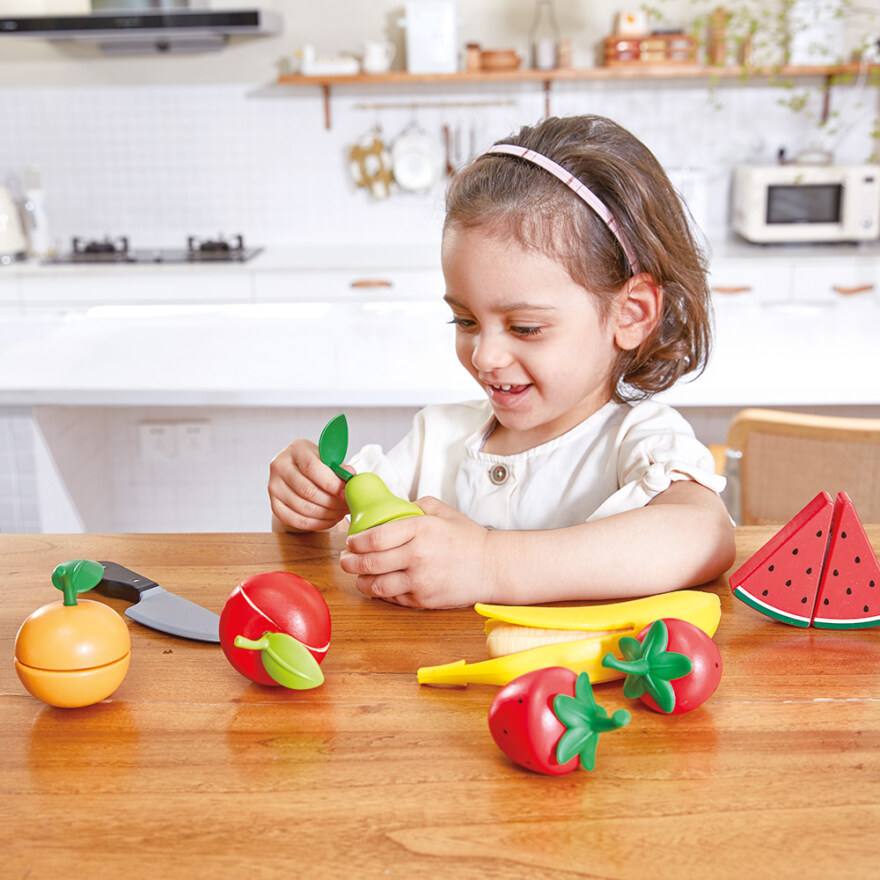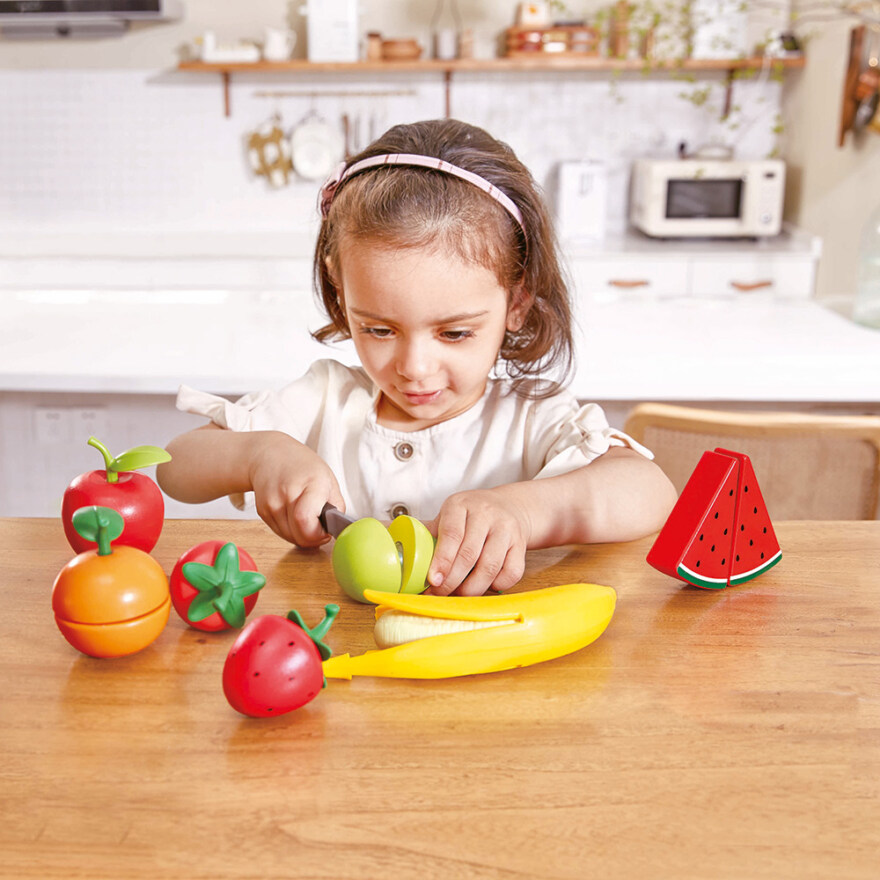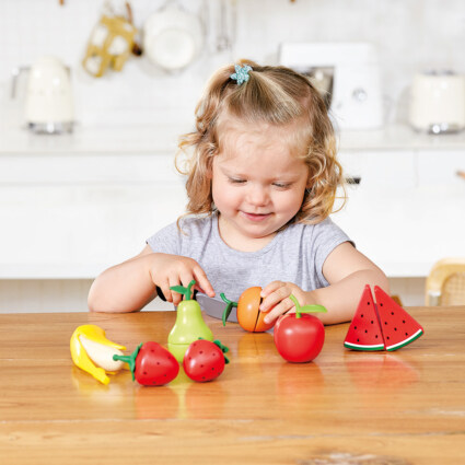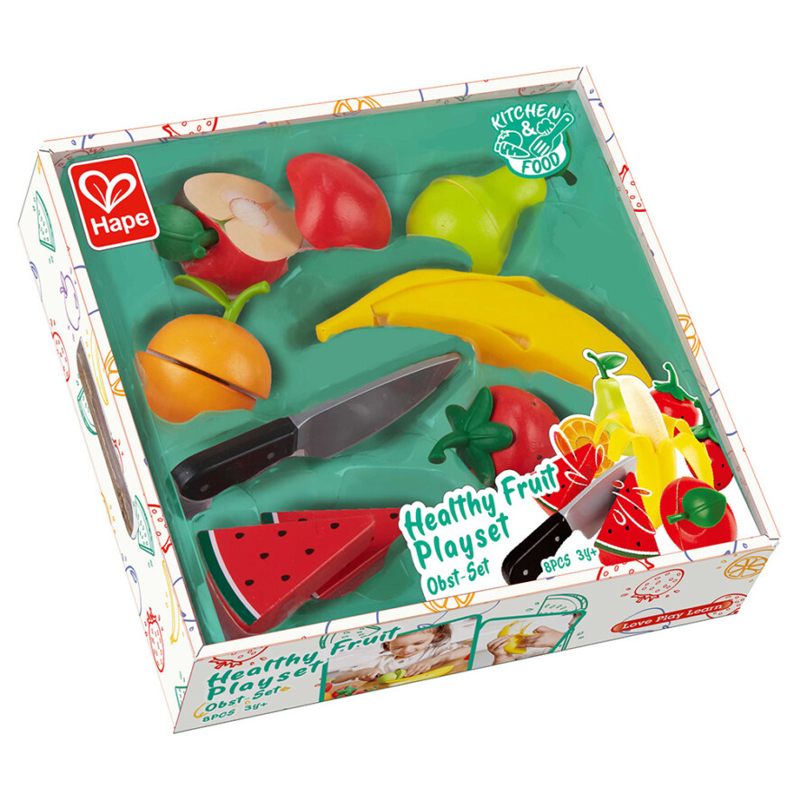 Bli vant til å spise sunt med dette søte Hape Sunn Frukt Lekesett. Inkluderer to jordbær, en pære, en appelsin, et eple, en vannmelonskive, en banan og en realistisk lekekniv. Bananen kan skrelles som en ekte banan. Eple, pære, appelsin og jordbær har avtagbare stilker. Skjær pæren, appelsinen, eplet og vannmelonen i skiver med lekekniven. Med glatte runde kanter og flott for å hjelpe til med å utvikle finmotorikk så vel som språk og sosiale ferdigheter.