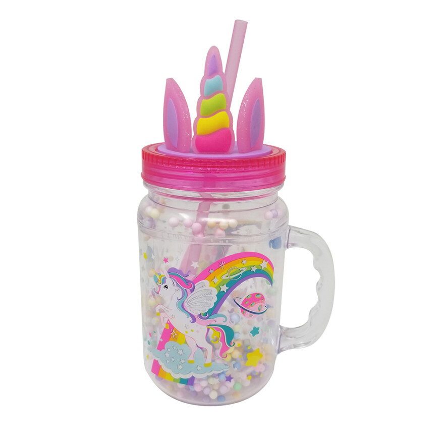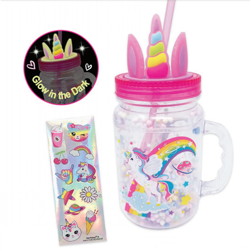 Denne magiske drikkekoppen med enhjørningmotiv lyser i mørket og gjør hver slurk litt mer spennende. Med sugerør og klistremerkeark kan barnet dekorere koppen og gjøre den helt personlig. Perfekt for både hjemmebruk og på farten.