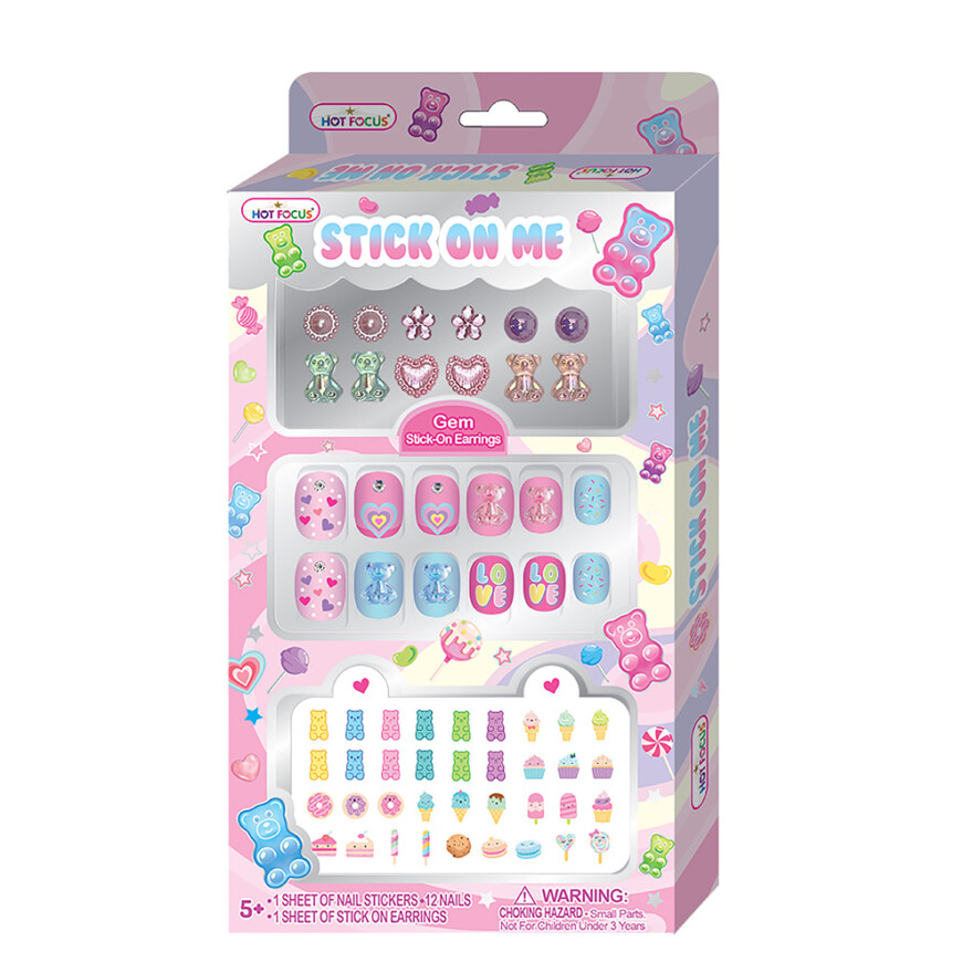 Hot Focus Negle- og ørepynt sett inneholder 12 "trykk på" negler, 36 "stick-on" negler og 12 "stick-on" ørepynt.