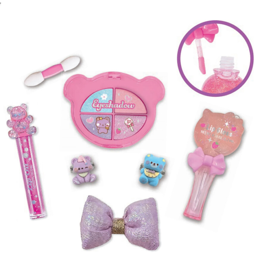 - Inneholder øyenskyggepalett, hårklemme, leppepomade, leppeolje og 2 ringer