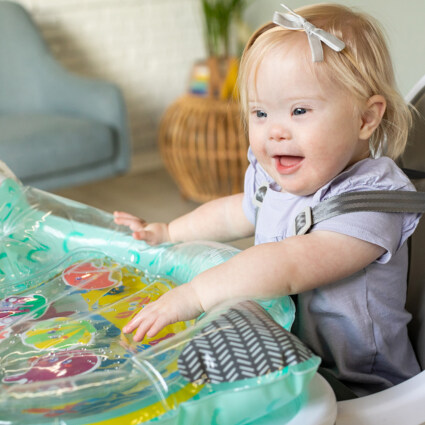 Lyse, dristige farger og visuell stimulering holder de små underholdt (og distrahert!) under magetid-trening eller på farten!
