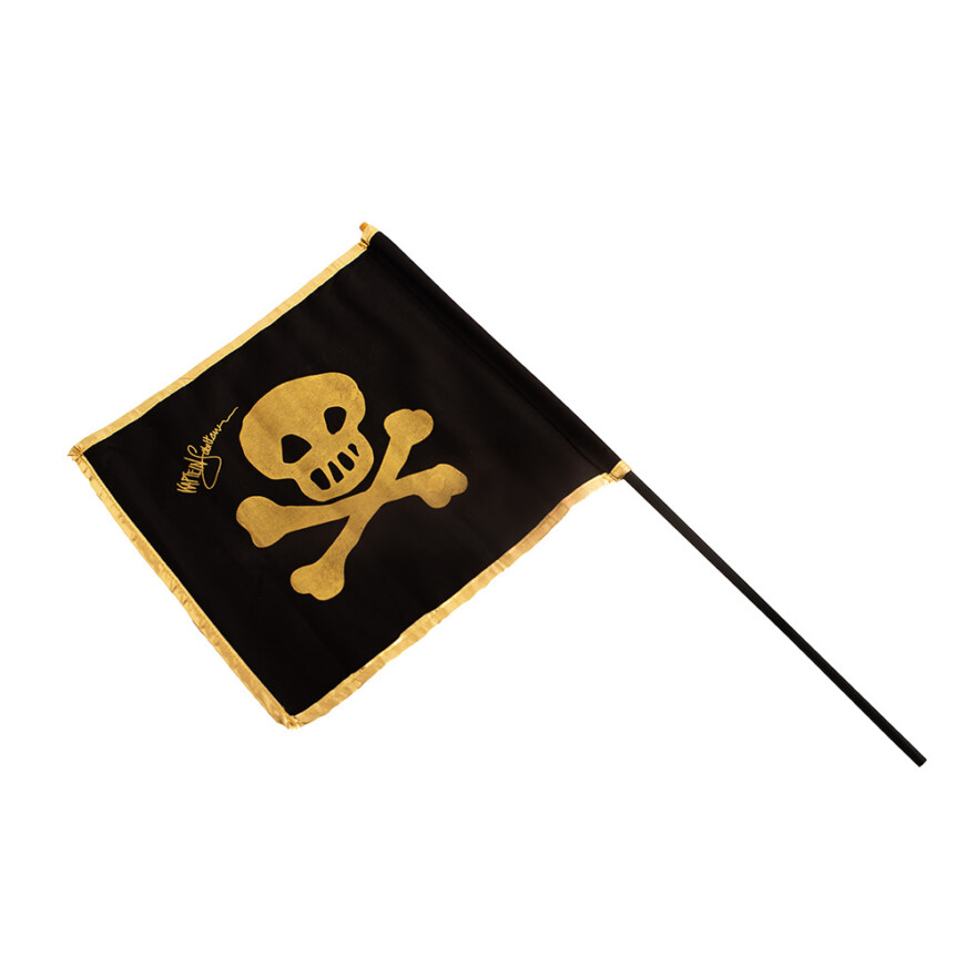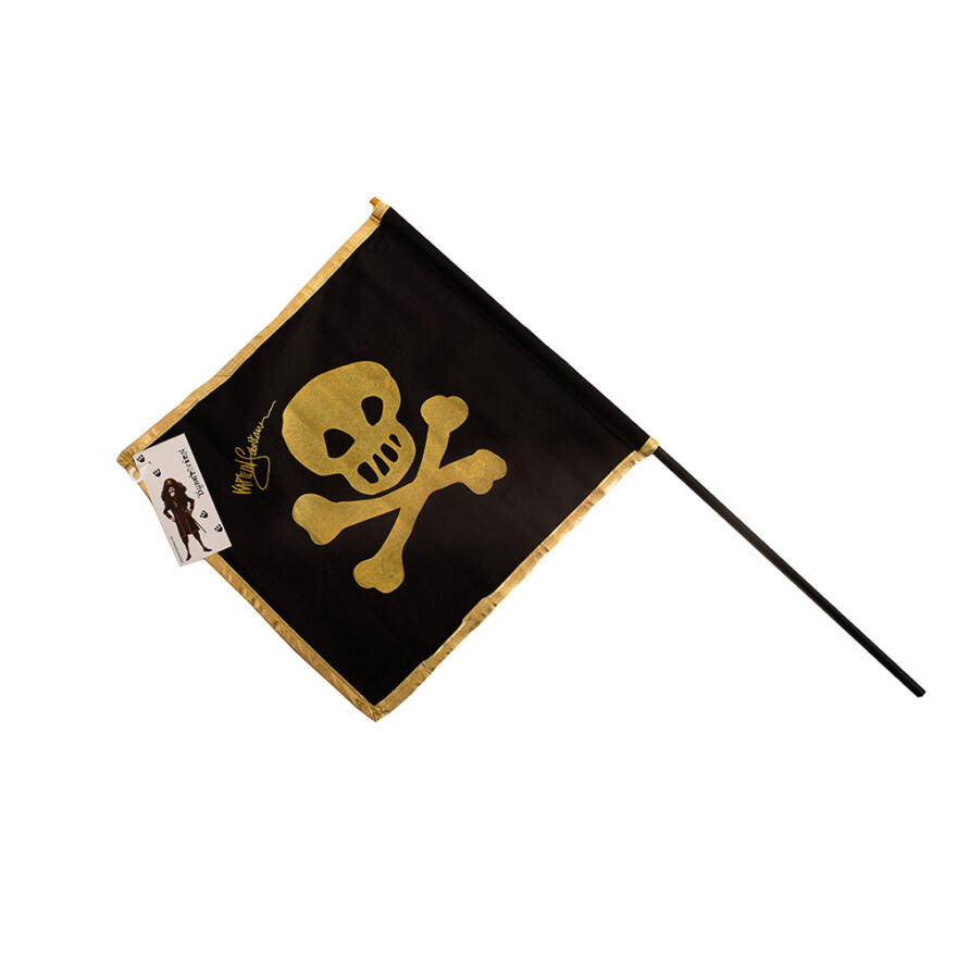 Gjør piratleken komplett med dette tøffe sorte piratflagget! Med et gullfarget dødninghode og Kaptein Sabeltanns signatur, er dette flagget et must for små pirater på tokt. Perfekt for å holde i hånden og heise høyt under spennende eventyr.