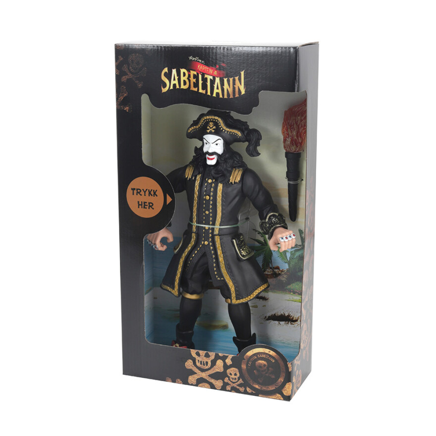 Hiv o'hoi, små og store sjørøvere! Her får du en imponerende figur på hele 30 cm av selveste Kaptein Sabeltann, med flotte detaljer og lyd. Trykk på den skjulte gullknappen på jakken, og hør Kapteinen le med sin mørke latter.