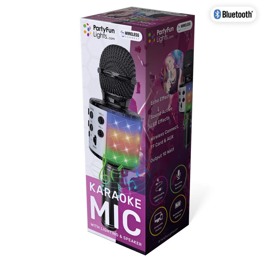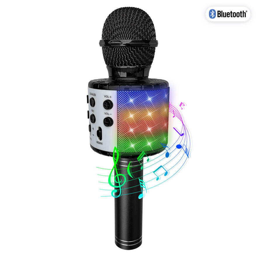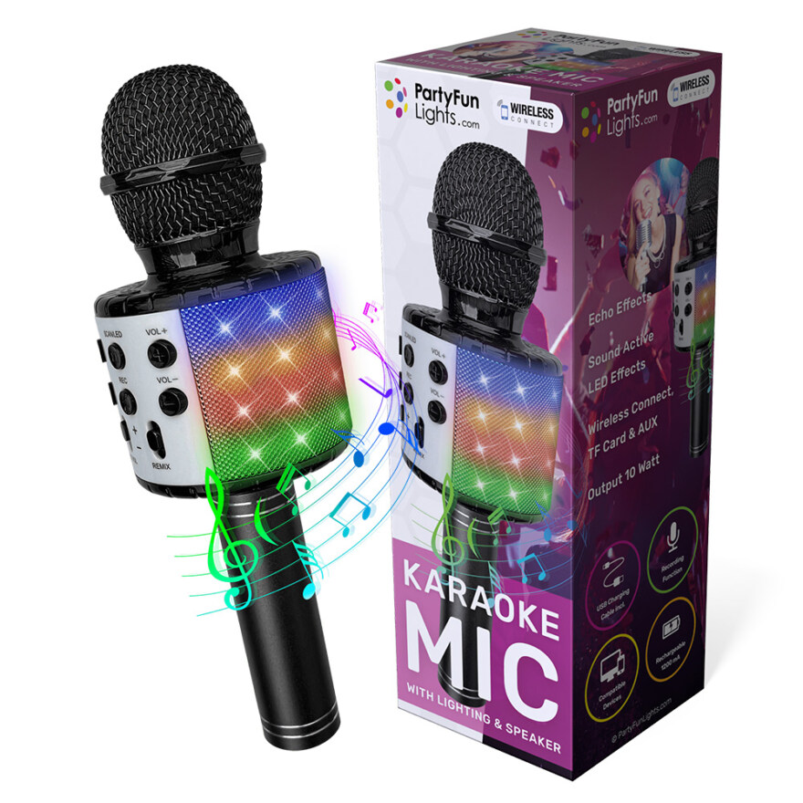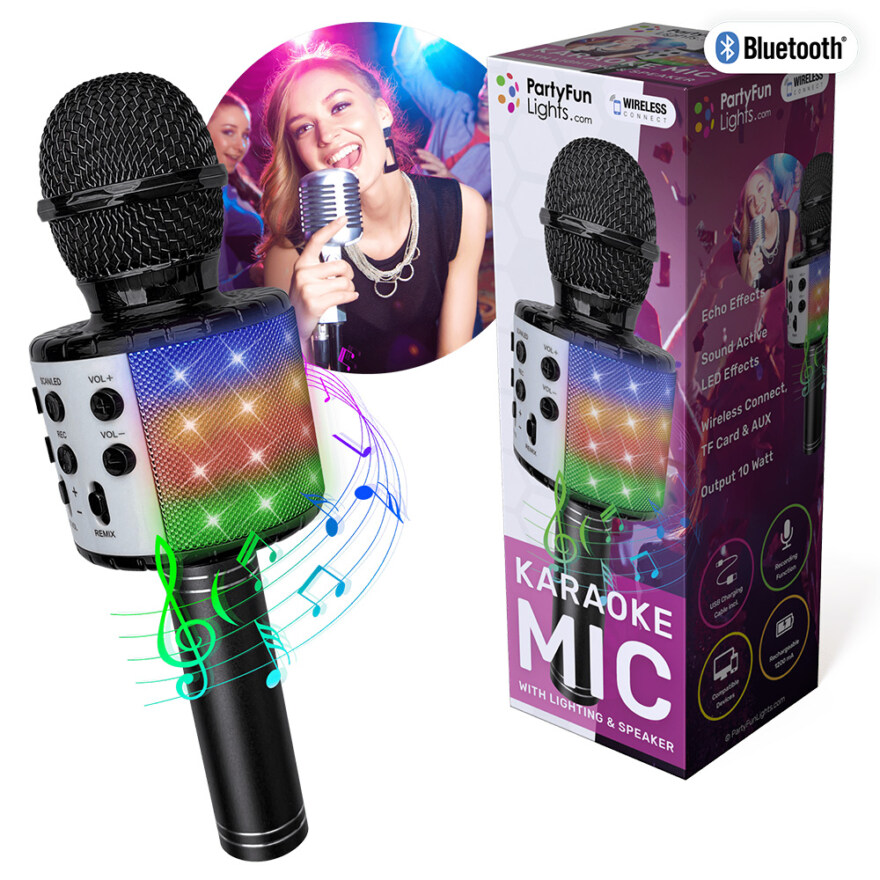 Ta festen til neste nivå med karaokemikrofon som har integrerte høyttalere og kule LED-lys i flere farger. Med Bluetooth-tilkobling og en rekkevidde på opptil 10 meter, kan du synge trådløst og bevege deg fritt. Mikrofonen kan brukes både trådløst med et oppladbart batteri via USB, eller med en AUX-lydkabel for uavbrutt moro. Perfekt for alle som elsker å synge og underholde!