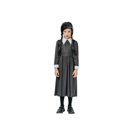 Forvandle deg til gotisk-look med dette stilige kostymet! Inkluderer en svart kjole med hvite prikker og en elegant hvit krage. Perfekt for kostymefester, Halloween, eller temafester, gir dette kostymet en unik og mystisk look. Parykk og strømpebukse er ikke inkludert. Gjør deg klar til å skremme venner og familie!