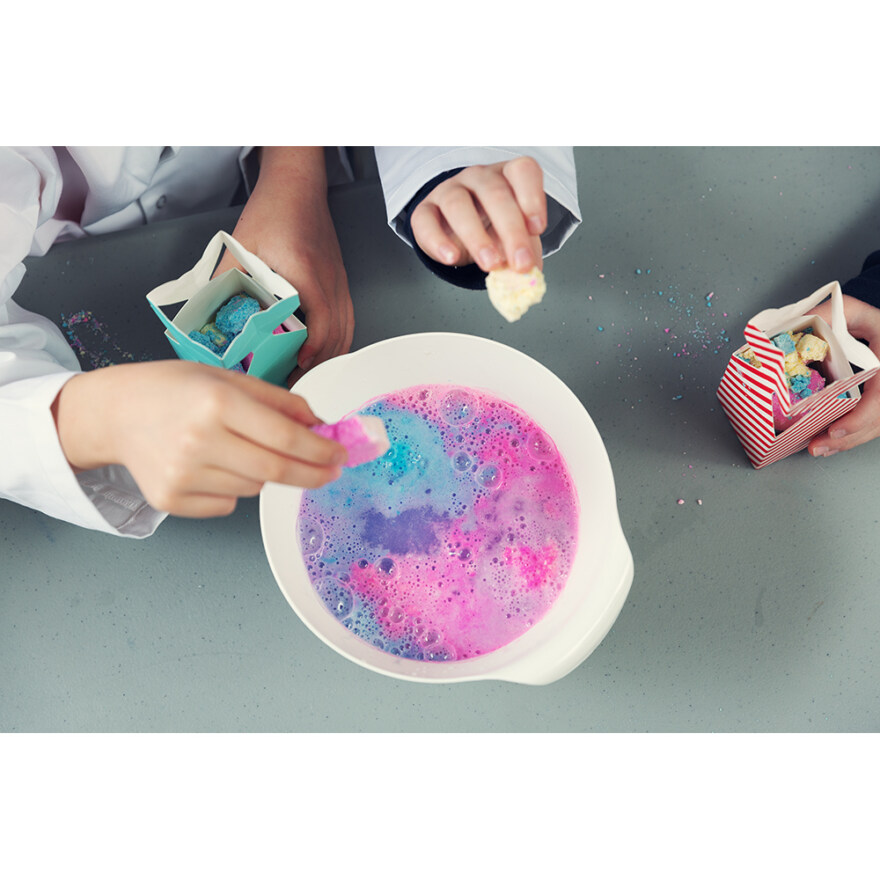 Med «Brusende badebomber» kan du bli en ekte badebombeforsker! Settet lar deg lage fargerike, brusende badebomber i alle regnbuens farger. Utforsk spennende kjøkkenkjemi og oppdag reaksjonene som får det til å boble og bruse i vannet!
