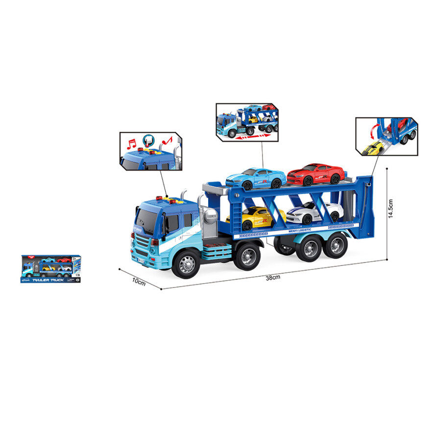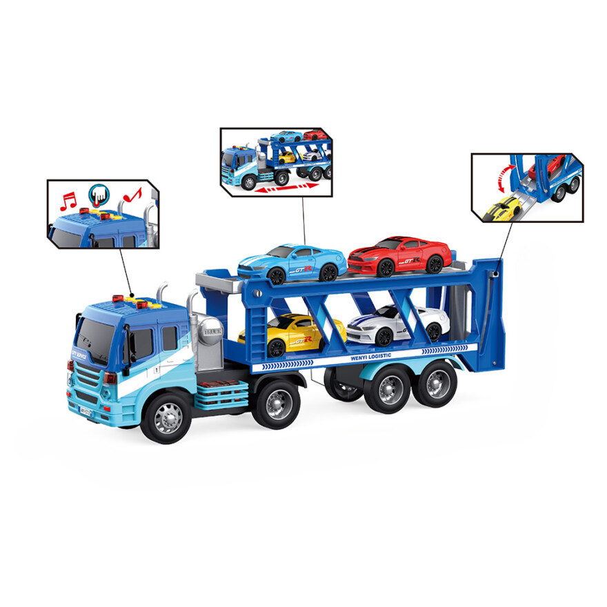 En stilig og robust biltransporter på 38 cm med fire medfølgende biler, perfekt for barn som elsker kjøretøy og actionfylt lek. Transporteren har lys og realistiske lyder som gjør leken ekstra levende, og friksjonsfunksjonen gjør at den fortsetter å rulle når barnet skyver den fremover eller bakover. Et kvalitetssett som gir mange timer med kreativ billek.