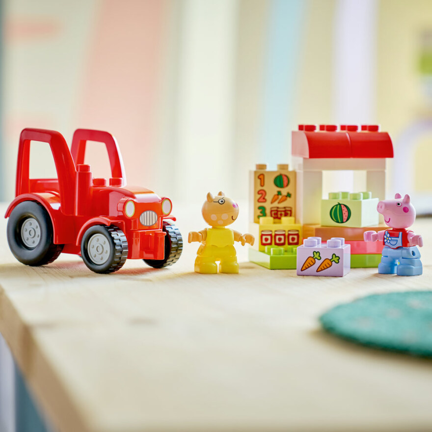 - Inkluderer en kjørbar, rød traktor, gårdsbutikk og figurer av Pedro Ponni og Peppa Gris