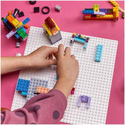 Denne hvite basisplaten med 32 x 32 knotter åpner for utallige fantasifulle lekemuligheter. Fra snødekte landskap og solfylte skibakker til isdekte områder med spennende arktiske dyr. Og når den kreative byggingen er over, kan barn frakte og stille ut modellene sine uten å være redd for at de skal gå i stykker.